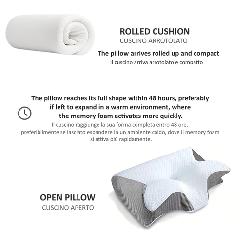 🔸 Il cuscino raggiunge la sua forma completa entro 48 ore, preferibilmente se lasciato espandere in un ambiente caldo, dove il memory foam si attiva più rapidamente. Il memory foam risponde al calore e al movimento: basta manipolare leggermente il cuscino per aiutarlo ad attivarsi e permettergli di riprendere la sua forma originale ancora più rapidamente. Perfetto per ottenere subito il massimo comfort.