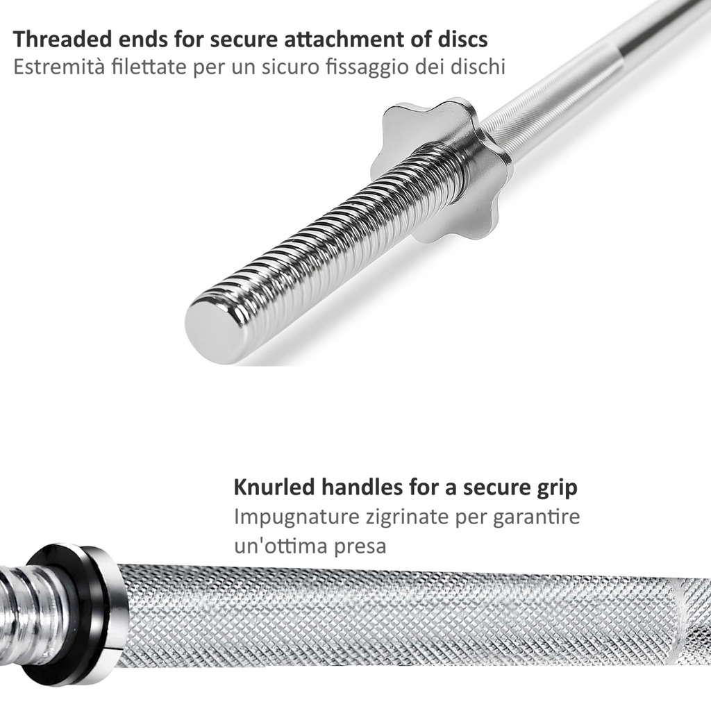 🔸 Il Bilanciere dritto da 180 cm con diametro da Ø 25 mm è realizzato in acciaio cromato ultra-resistente, garantisce massima stabilità e sicurezza. Le impugnature zigrinate antiscivolo offrono una presa salda e confortevole, ideale per allenamenti intensi sia a casa che in palestra.